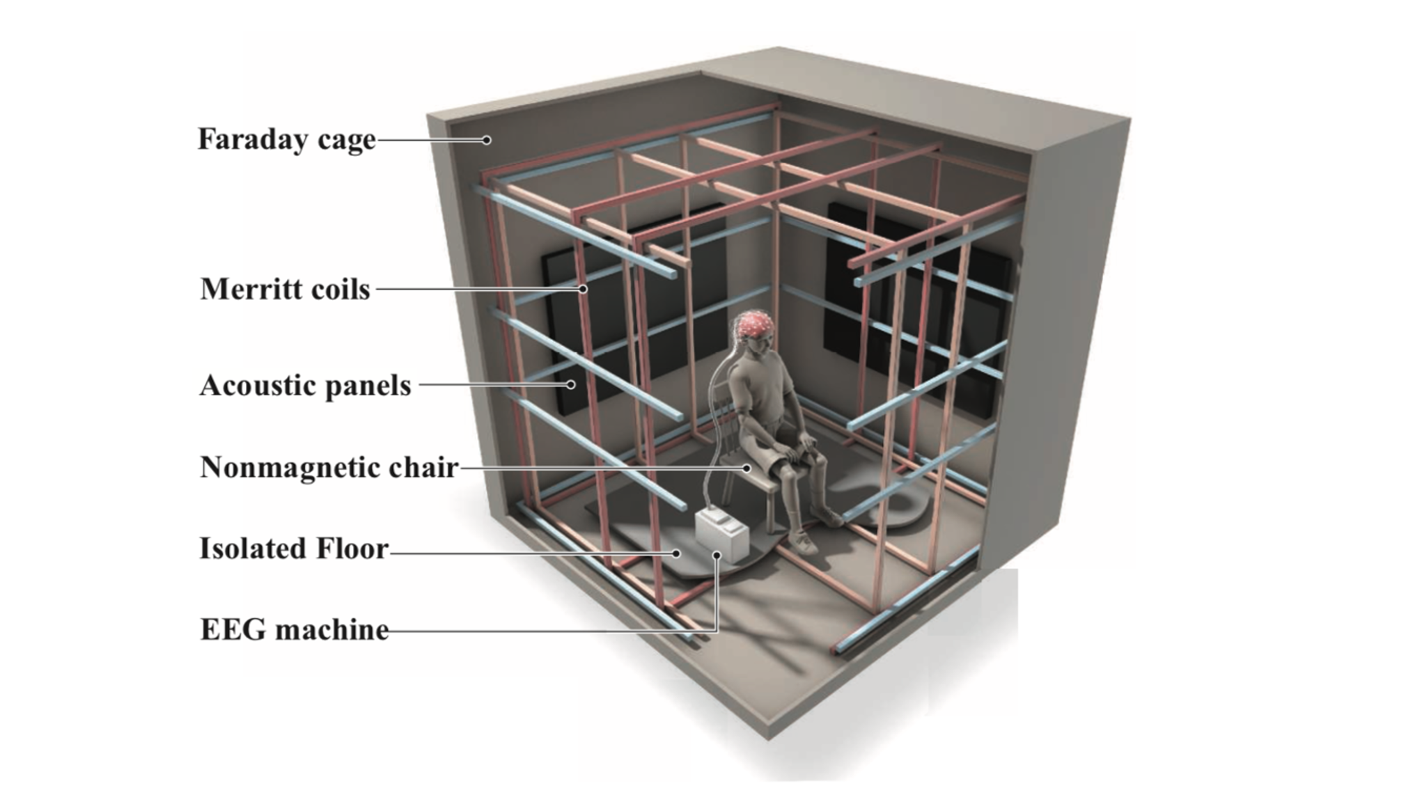 In our experiment, the participant relaxes in an extremely comfortable chair inside a radiofreqency shielded test chamber. Inside the chamber is a set of large square coils, setup along three different directions (up/down, E/W, N/S) through which electric current flows to generate an Earth-strength magnetic field within.